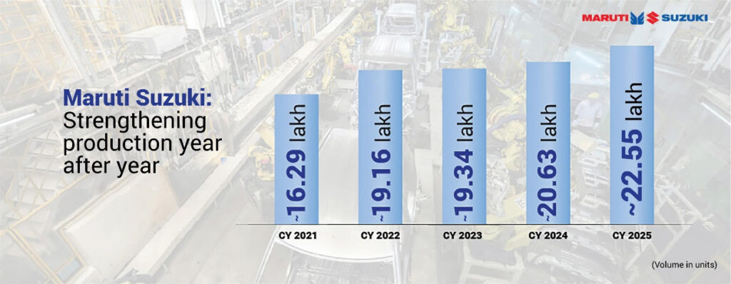 Maruti Suzuki India Limited has set a new production benchmark by manufacturing over 22.55 lakh vehicles in calendar year 2025, marking its highest-ever annual output. This achievement also makes 2025 the second consecutive year in which the company has crossed the 20 lakh production milestone, underlining its strong manufacturing momentum.